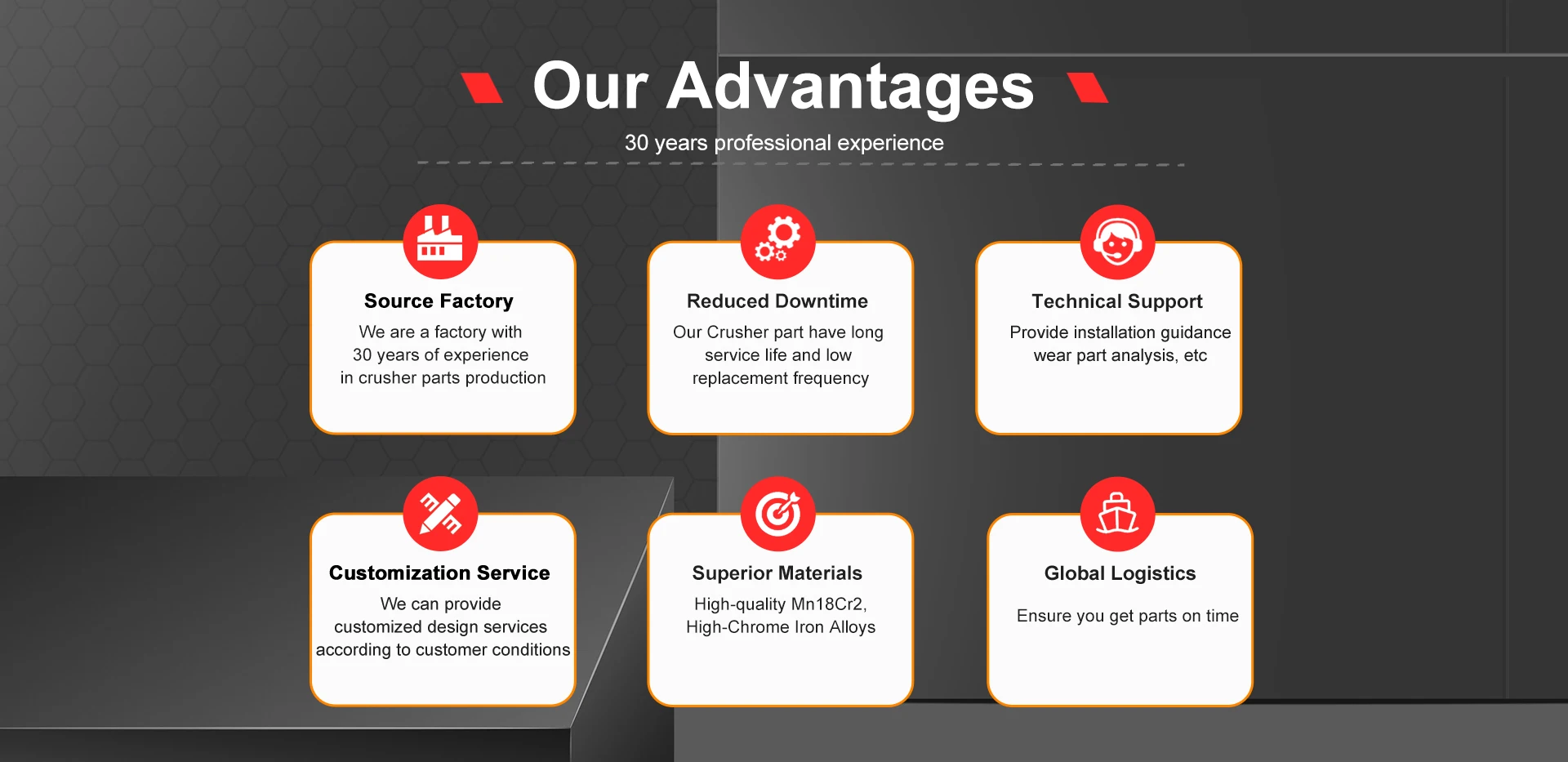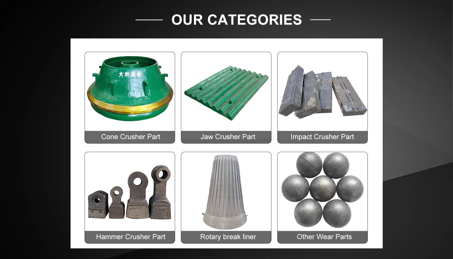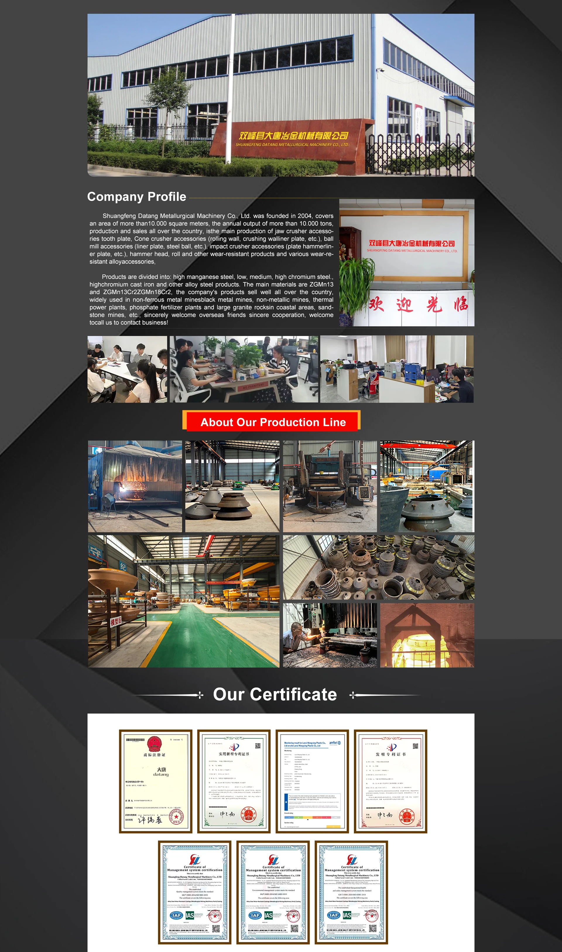 Productos principales:Pieza de trituradora de cono, pieza de trituradora de mandíbula, pieza de trituradora de impacto